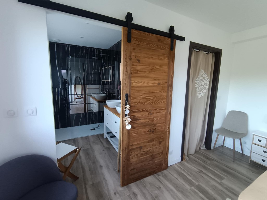 Rez de chaussée : - Entrée sur vaste pièce de vie avec cuisine équipée à l'Américaine , et pourvue de baies vitrées coulissantes donnant sur une grande terrasse avec magnifique vue Lac et coteau , 1 suite parentale ( accès terrasse ) avec dressing et salle d'eau , wc , buanderie , dégagement .