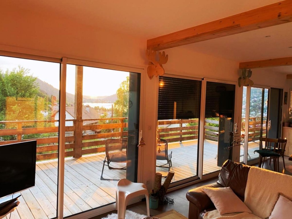 Coteau prisé , exposition sud ouest , vue panoramique sur le Lac , 170 m2 , 5 min à pied du centre de Gérardmer par une bucolique passée communale , un terrain de 1050 m2 avec la possibilité d'y ajouter des équipements tels que piscine ou autres , une partie habitation confort , lumineuse et ensoleillée toute la journée , un garage pour 3 voitures d'environ 60 m2 facilement transformable en 1 appartement avec vue lac , ET déjà existantes et exploitées , 2 chambres d'hôtes tout confort au rez de jardin avec accès privatif , le beau Chalet multi cartes en somme .