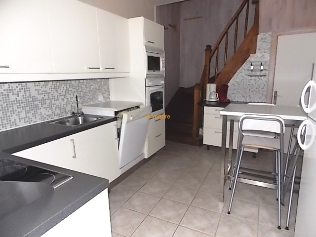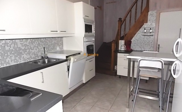 Rez : - Sas d'entrée , Cuisine super équipée ( plaque vitro , électros Whirlpool etc .. ) coin repas , Salon avec poêle à bois , wc , accès cave et garage .