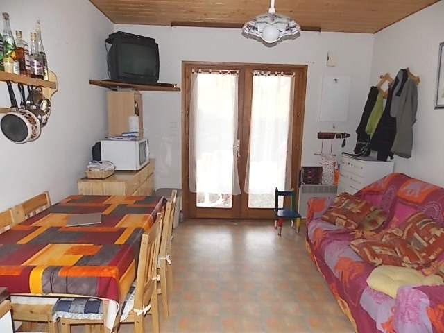 Pièce de séjour avec coin Cuisine aménagé , coin repas et placards ainsi qu'un canapé lit , 1 Chambre séparée avec 1 lit superposé , Salle de bain .