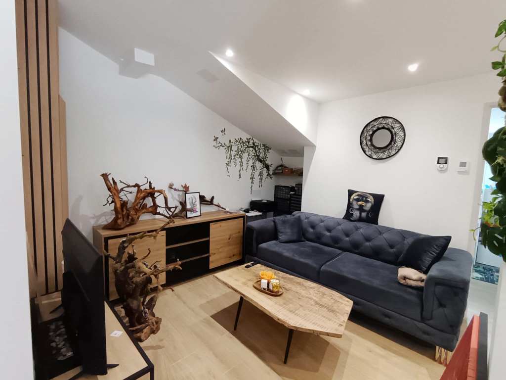 Entrée sur séjour avec Cuisine à l’Américaine complémentent équipée , espace repas , salon TV cosy , 2 chambres avec rangements , 1 belle salle d'eau avec douche à l'Italienne et meuble vasque avec miroir anti buée .