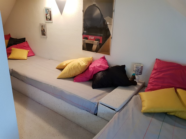 Étage : - ( surplombant le séjour ) 1 Chambre en mezzanine avec 3 couchages et rangements .