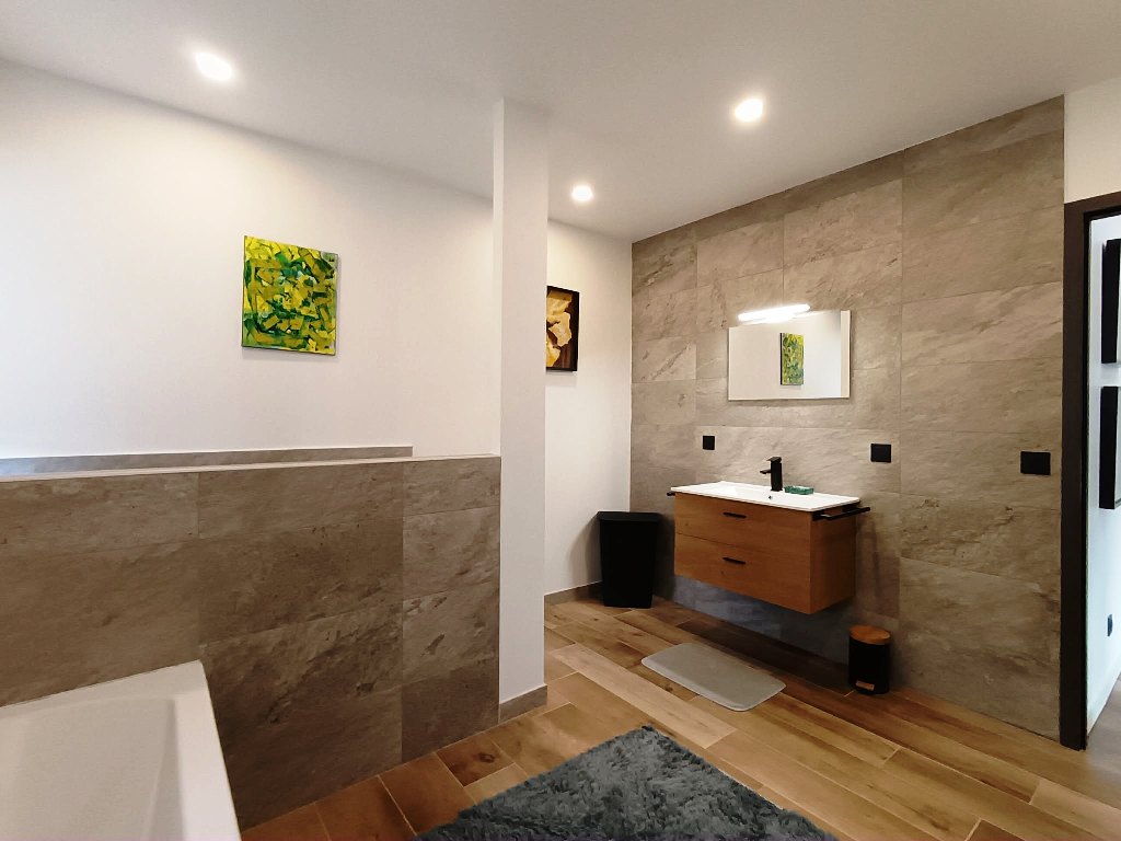 Rez de Jardin : - 2 Chambres , + un espace dédié complètement à l'espace détente , avec Sauna , Spa 4/5 pers , belle salle d'eau complète , fauteuil de massage , cellier , buanderie .