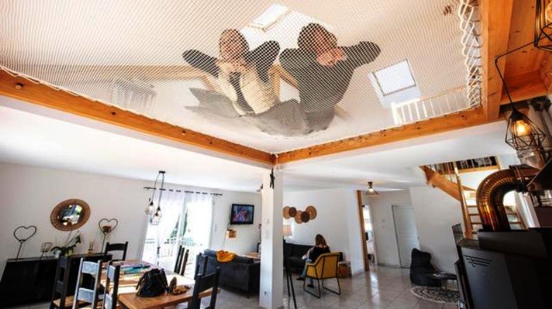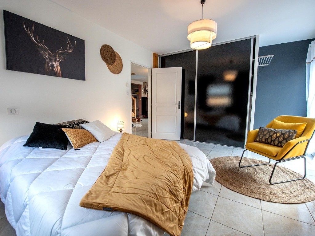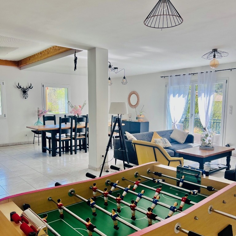 Étage : - un vaste espace en mezzanine avec coin jeux et accès au filet , qui dessert également 3 belles grandes chambres dont une équipé de lits cabane et autres ( prévue pour 4 enfants ) , une belle grande salle de bain avec baignoire et vasques .