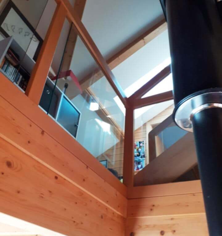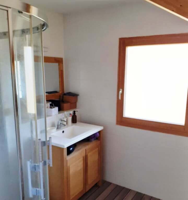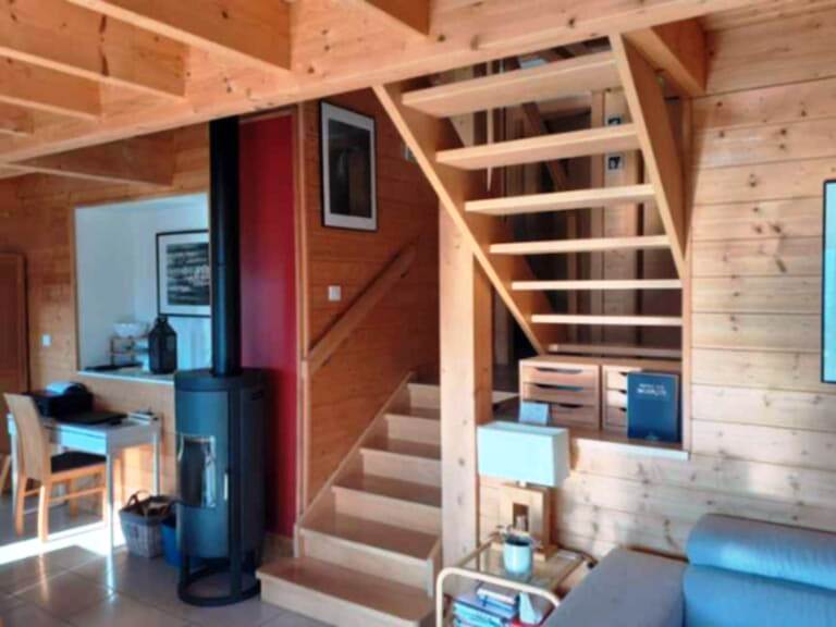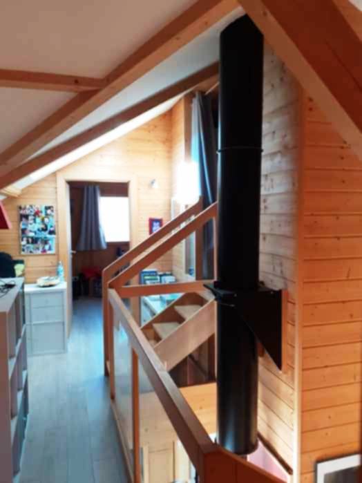 Rez de chaussée : - entrée protégée par sas entre garage et chalet , Hall d'accueil , grande pièce de vie de 40 m2 avec cuisine ouverte à l'Américaine offrant accès terrasse , ainsi que depuis la baie vitrée coulissante au niveau salon , wc séparé , cellier .