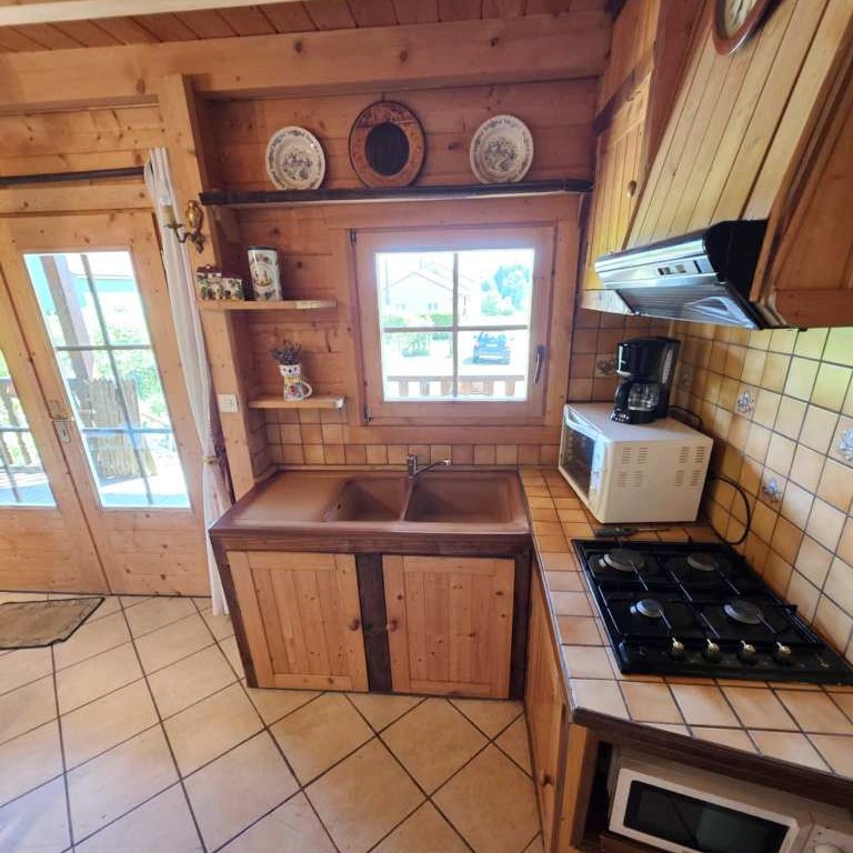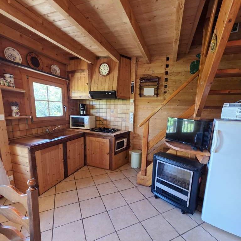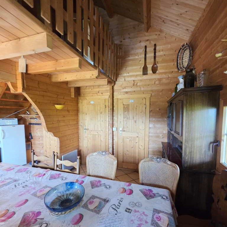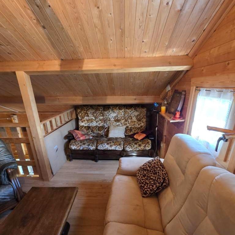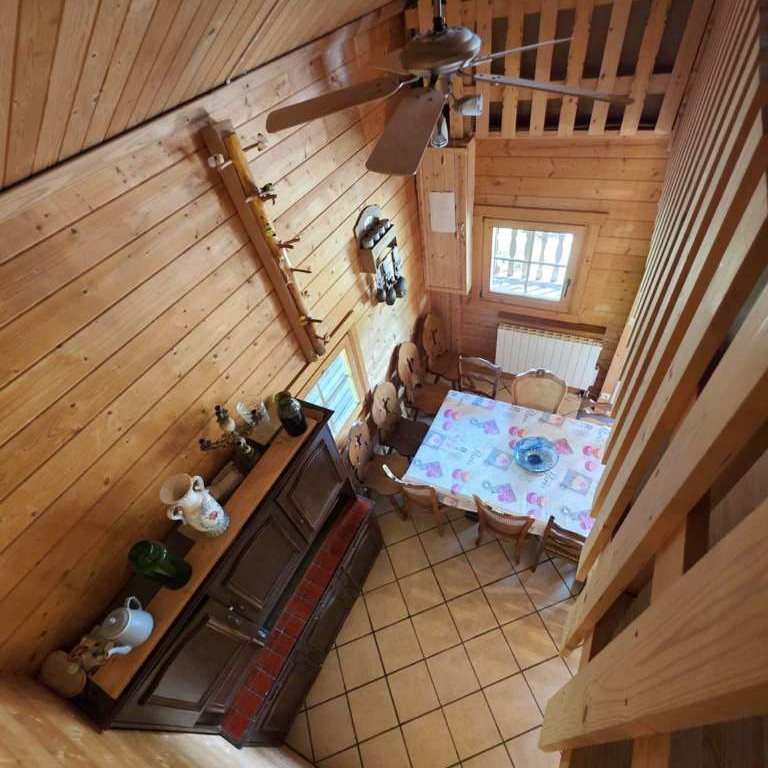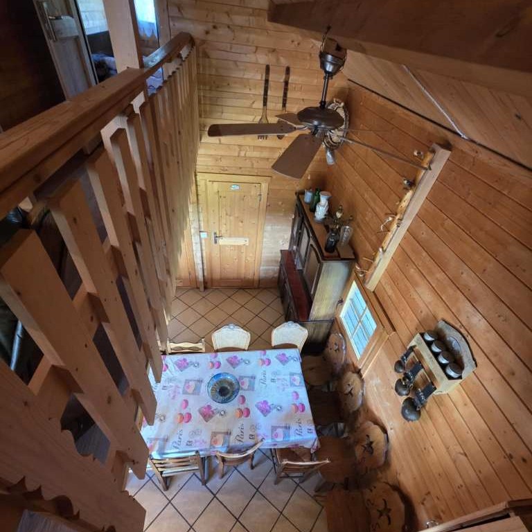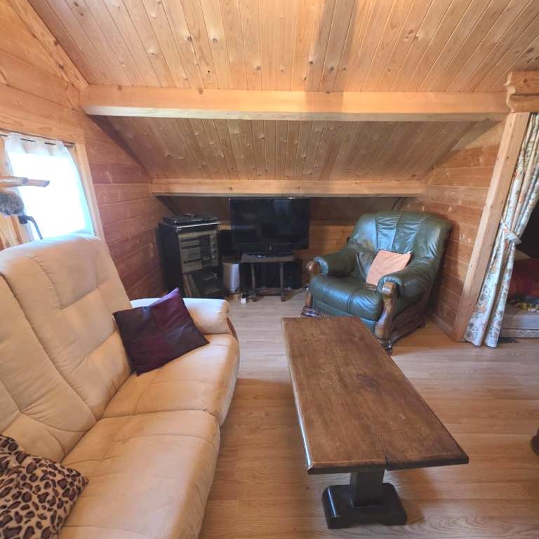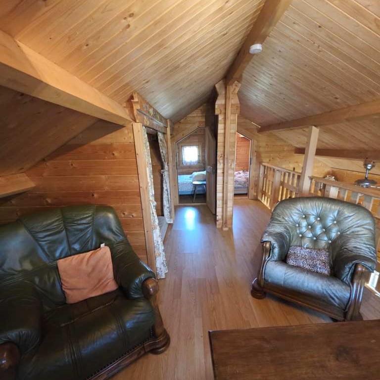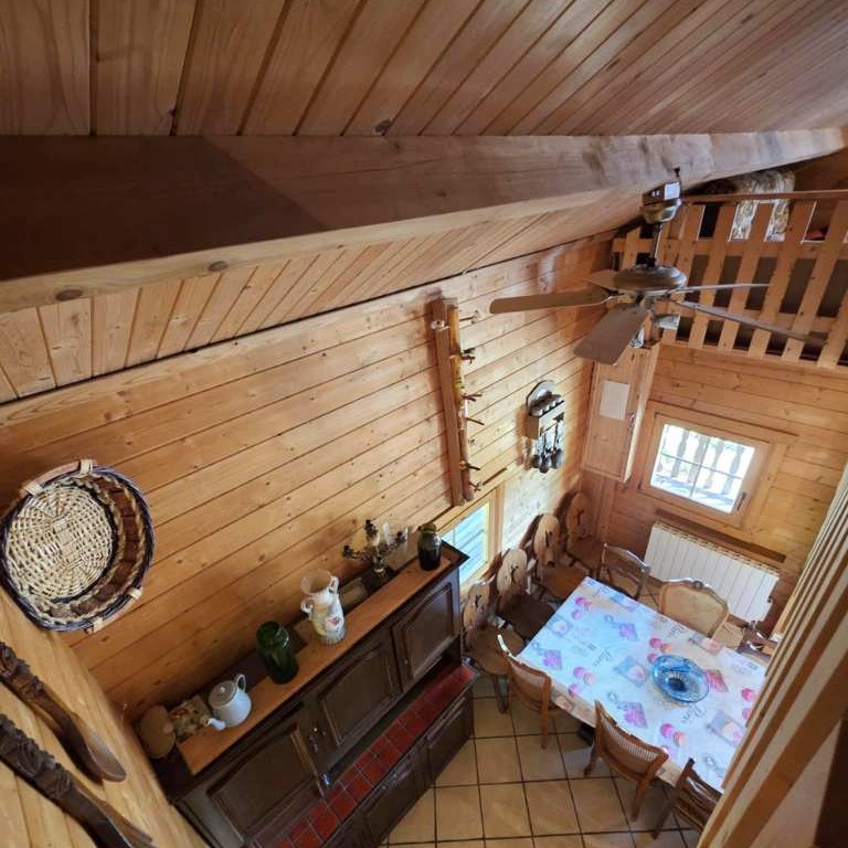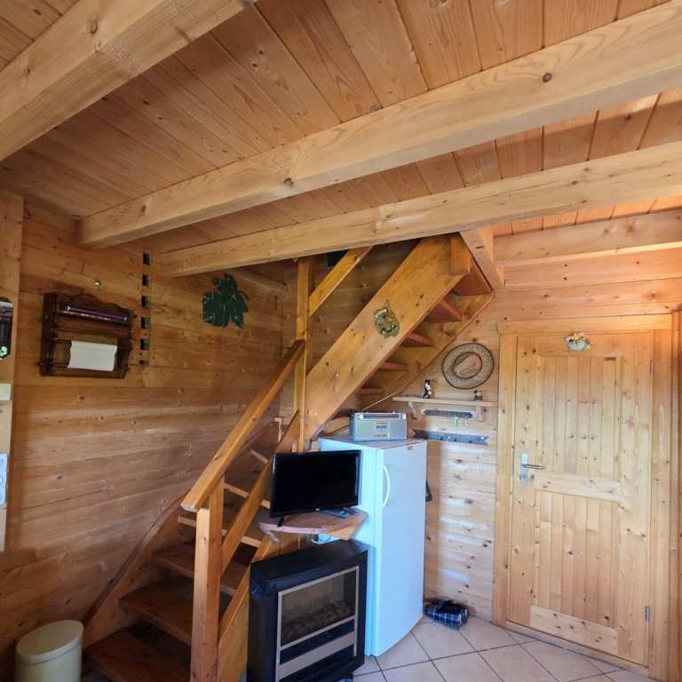 Rdc : - Entrée par une belle Terrasse couverte façon " chalet de cowboys " sur un séjour surplombé d'une agréable mezzanine et agrémenté d'un coin cuisine équipée , séjour desservant 1 Chambre , wc et salle d'eau .