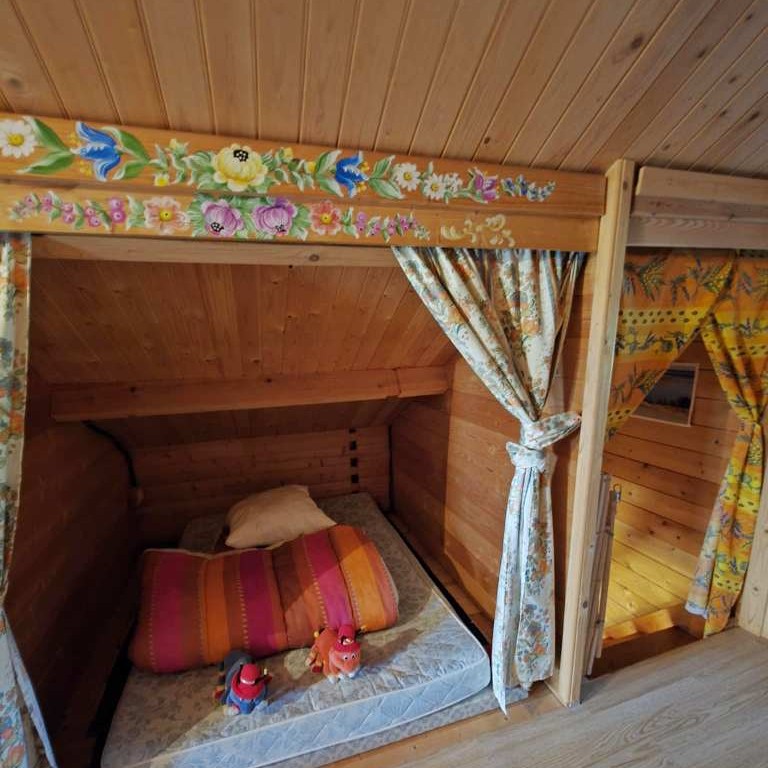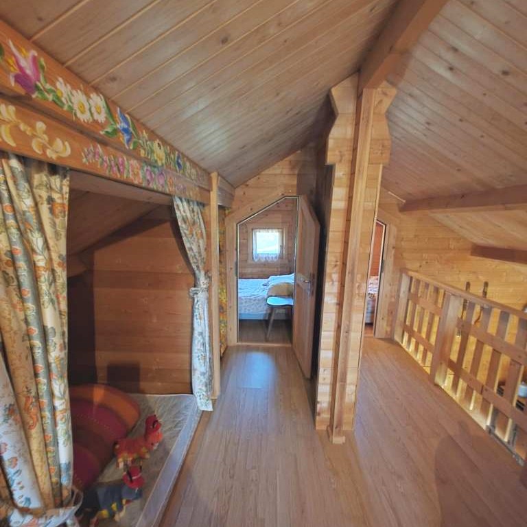 Étage : - Arrivée en haut d'escalier sur une belle pièce de vie en mezzanine , comportant un espace salon et un coin couchage en alcôve , et 2 chambres .