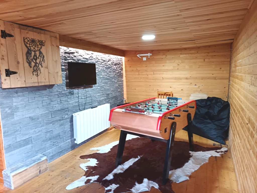 Rez de jardin : - Entrée sur vestiaire et salle de jeux ( Babyfoot etc .. ) , dégagement , 1 chambre avec lit superposé , 1 seconde grande avec lit 2 personnes et canapé convertible , buanderie .