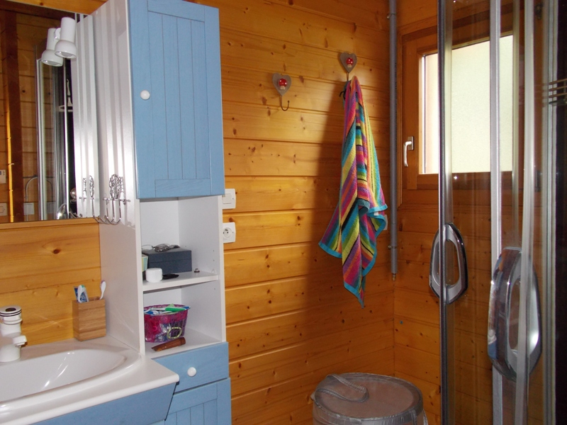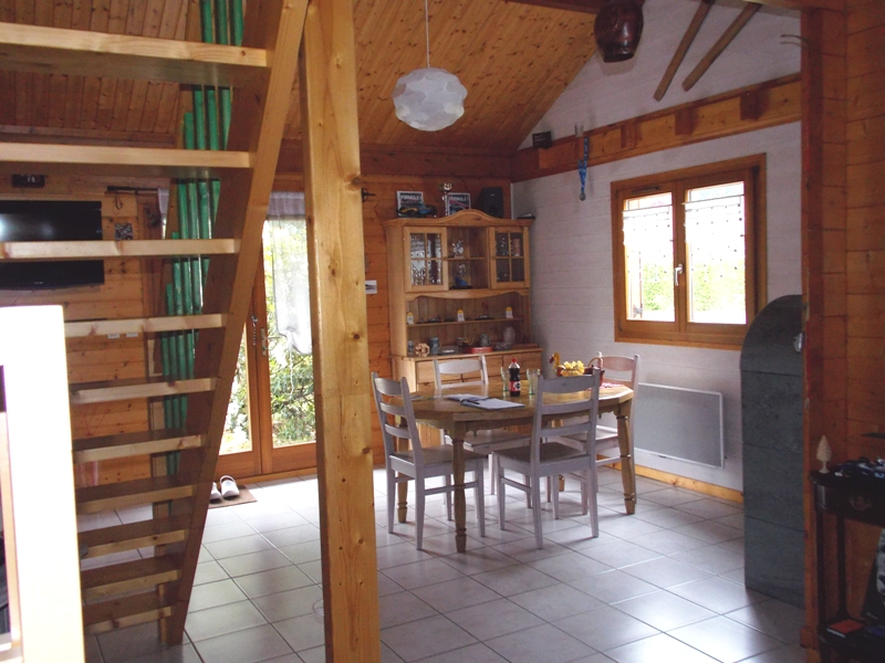 Rez de chaussée : - Séjour avec Cuisine équipée ouverte , 2 Chambres avec rangements , Salle de bain ( douche multijets ) , wc séparé , Garage avec grenier au dessus , le séjour donne accès vers le Jardin et la Terrasse vue sur étang .