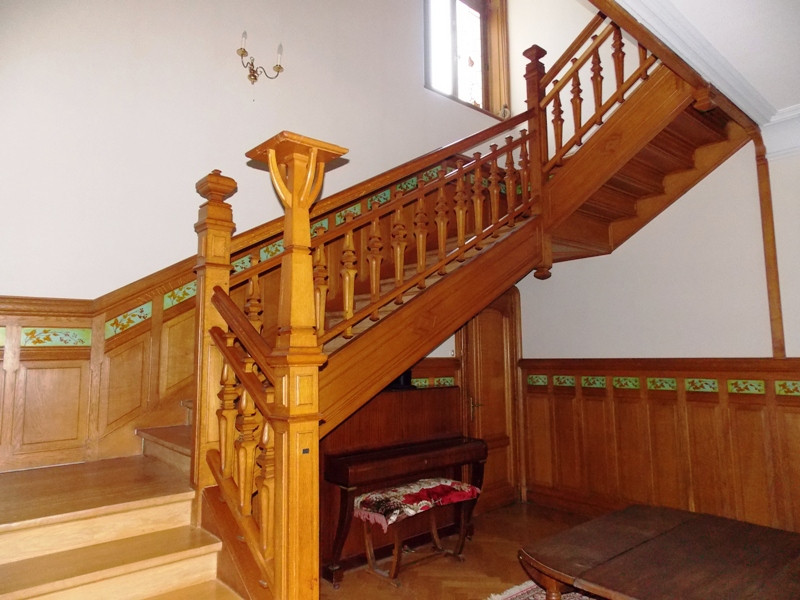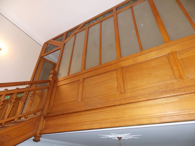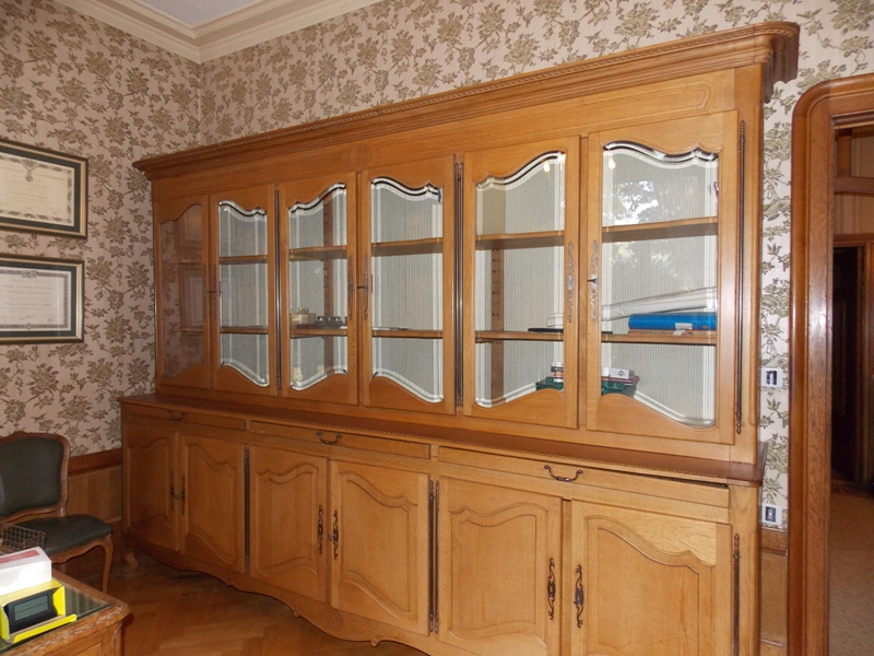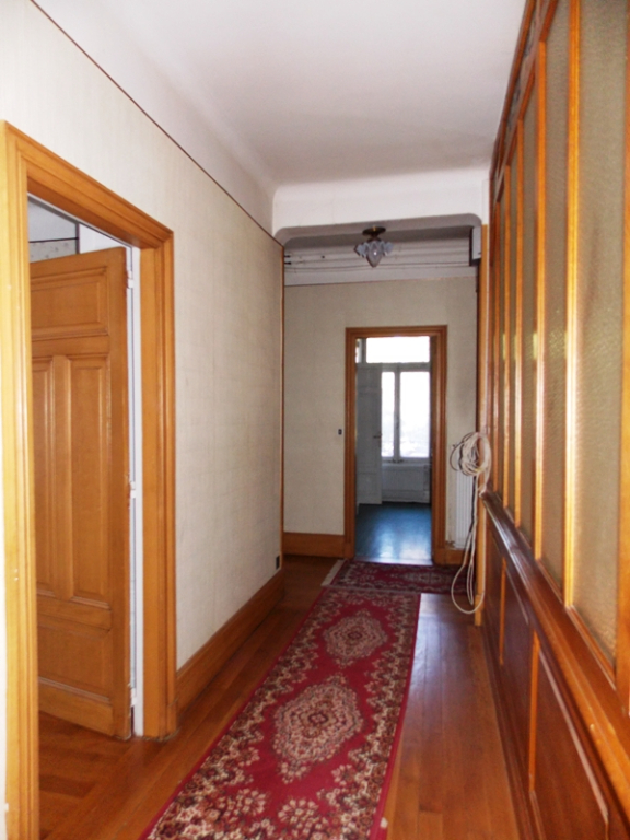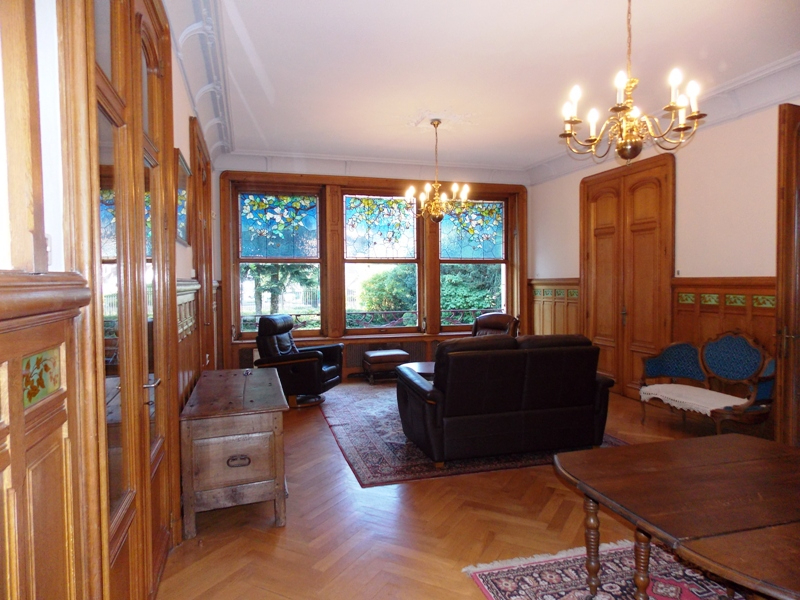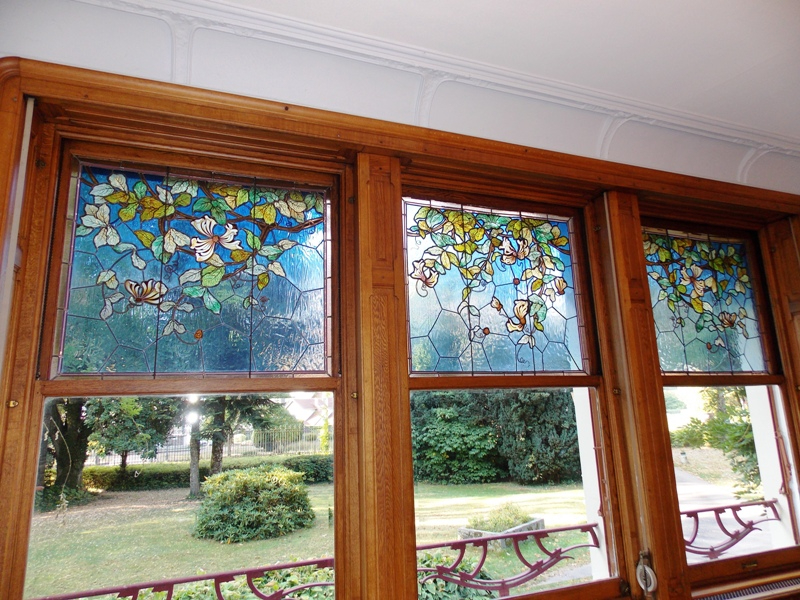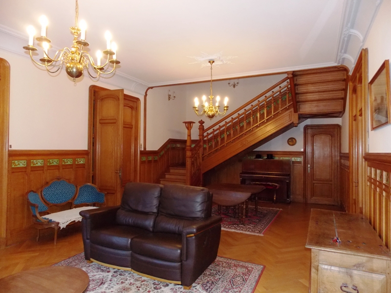 - Entrée principale , vaste pièce de réception avec fenêtres à vitraux signés J Grüber et escalier d'apparat avec frise de vitraux " opalines " gravés à l'acide et incrustés dans les boiseries , salle à manger , salon avec cheminée Louis XV à coquille en marbre grenat , vestiaires avec placards chêne massif clair , bureau avec bibliothèque , Cuisine équipée ( avec entrée de service ) , une salle de " classe " à l'époque mais peut convenir en chambre ou salle de loisir ( billard etc ) , escalier de service .
