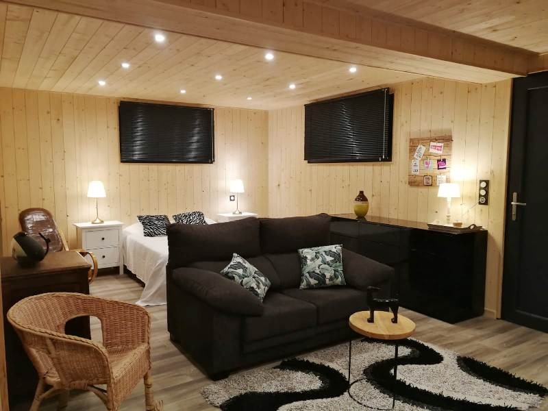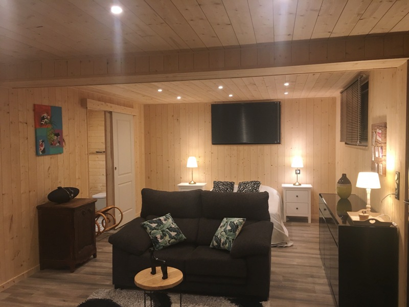 Rez de Jardin : - Beau Studio de 34 m2 comprenant ( Chambre , dégagement Salon Salle à manger , Salle de douche wc , rangement ) , Entrée indépendante par Terrasse extérieure avec vue Lac , 1 pièce séparée avec arrivée d'eau pour installer , sauna ou Jacuzzi ou salle de sport , Chaufferie buanderie .