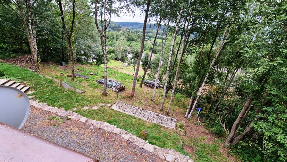 Rez de chaussée : - entrée , beau grand séjour en L avec cuisine équipée ouverte , le séjour donnant sur une belle grand terrasse surplombant le jardin , wc , 1 chambre ( idéal coin montagne lit superposé ) .