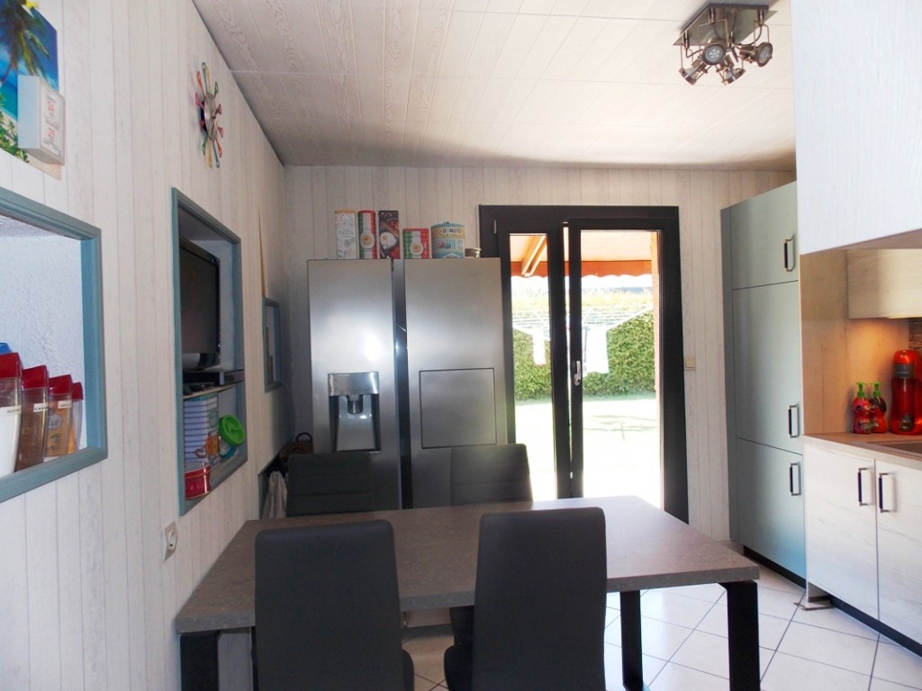 Rez de chaussé : - Entrée sur gd Séjour de près de 40 m2 avec cheminée insert tubée , et donnant sur une Terrasse couverte en façade , Cuisine équipée récente IXINA ( 2021 ) donnant sur grande Terrasse hyper ensoleillée , 3 Chambres , 1 Salle de bain neuve ( douche , meuble vasque , wc suspendu , emplacement machine et séchoir ) , Cellier .
