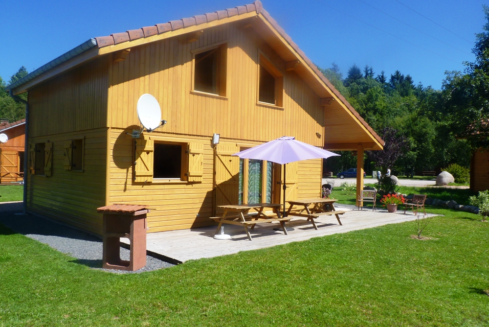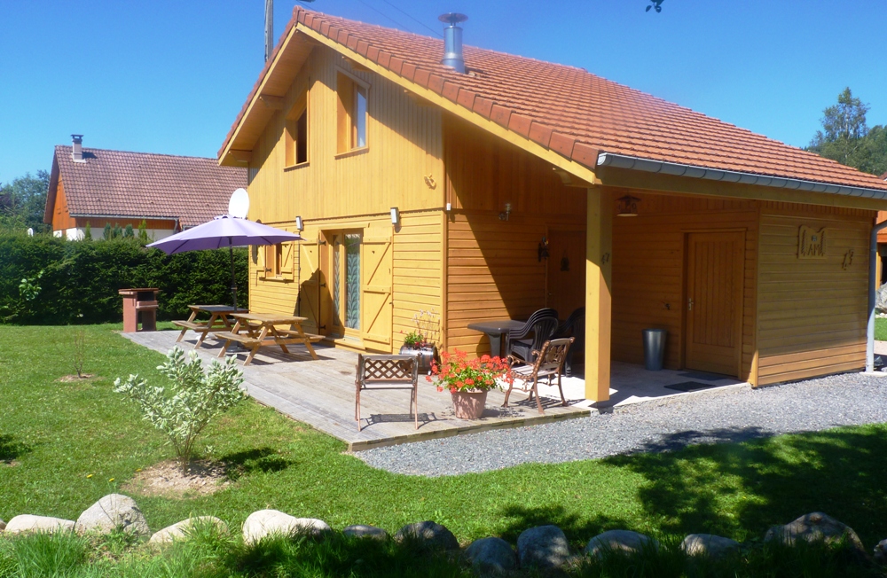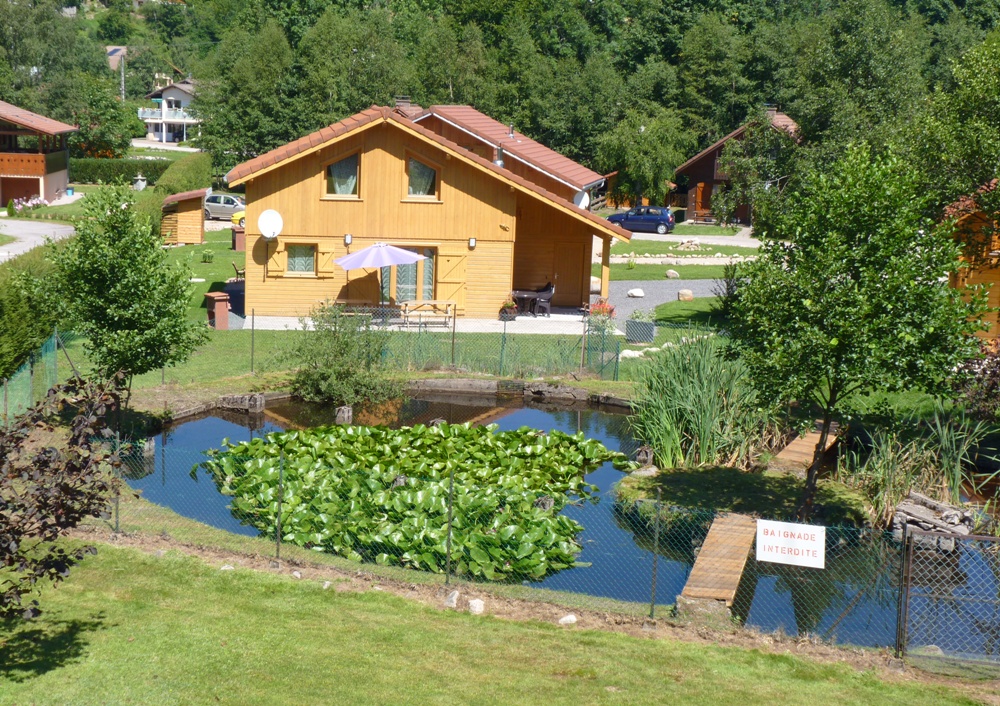 Chalet classé 3* tout confort, prestations de hautes qualité, lasure bio, haute isolation BBC laine de bois, avec une grande terrasse en bois aménagée en partie couverte donnant sur deux beaux étangs sécurisés pour les enfants .